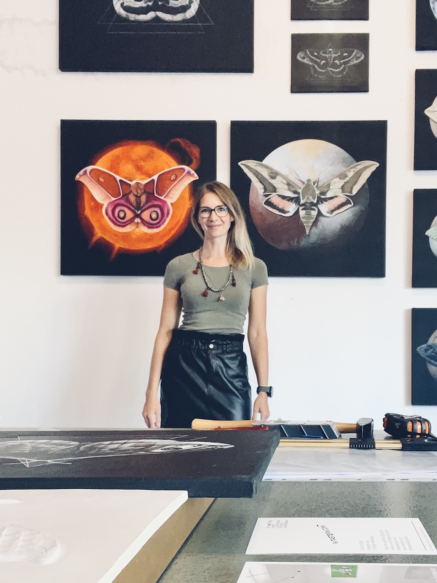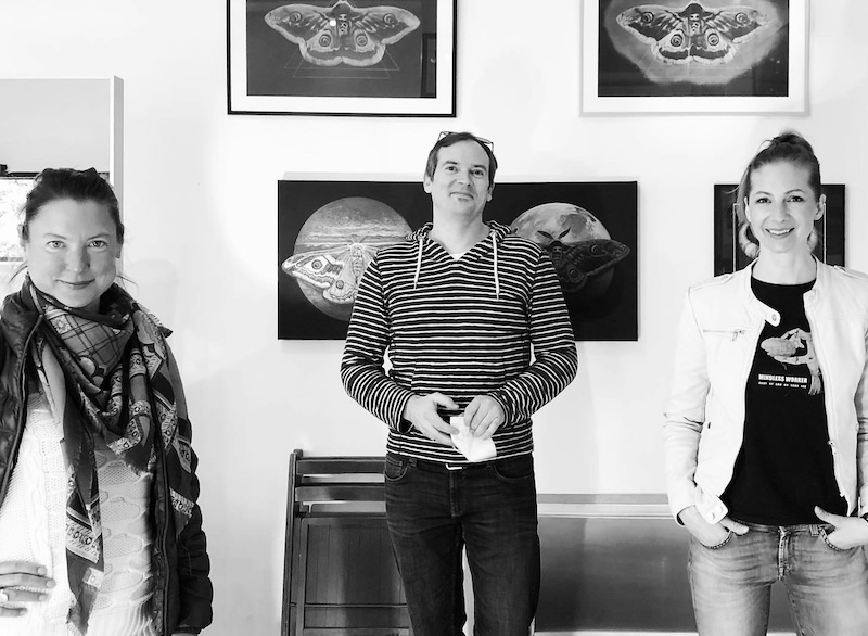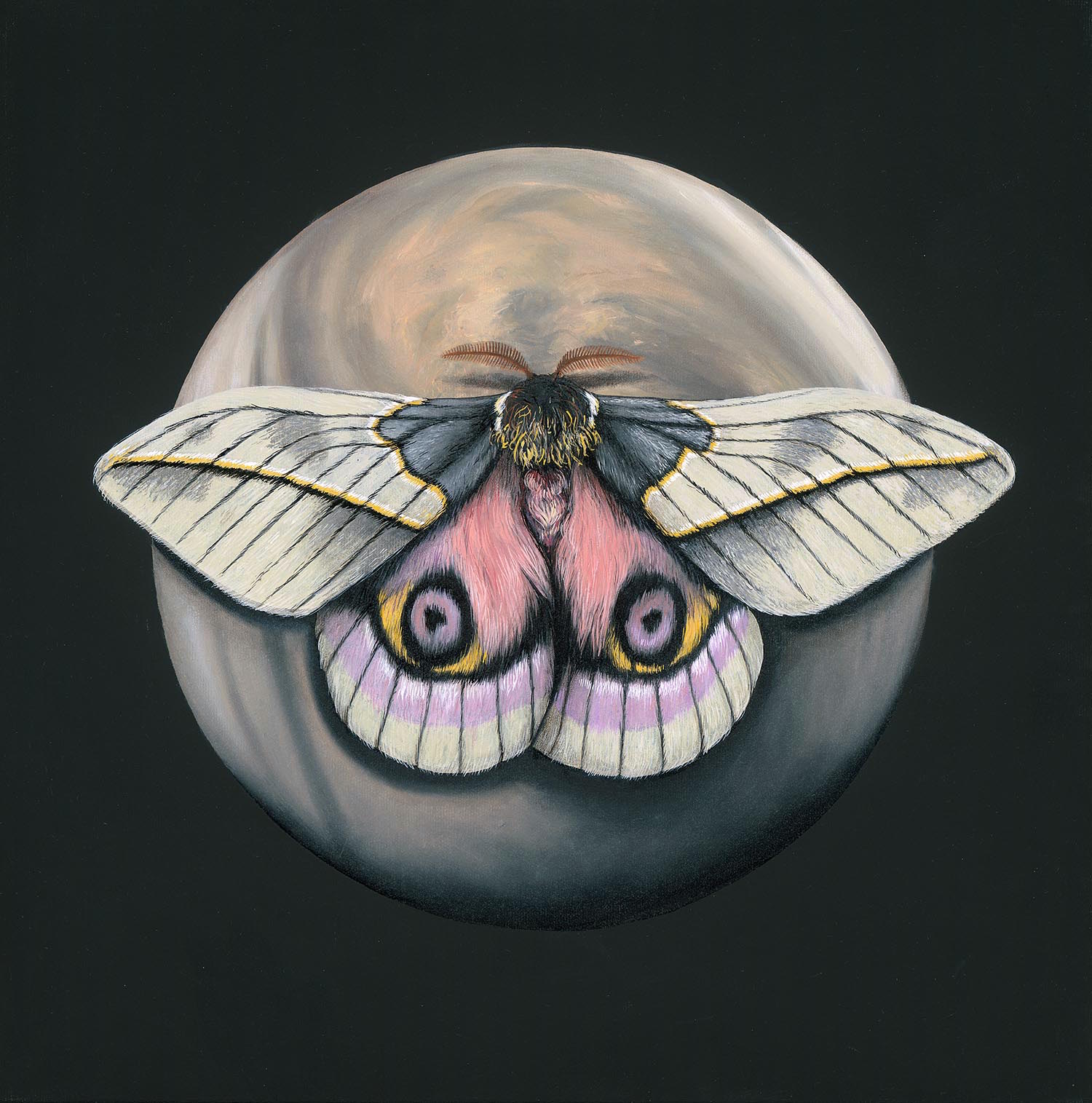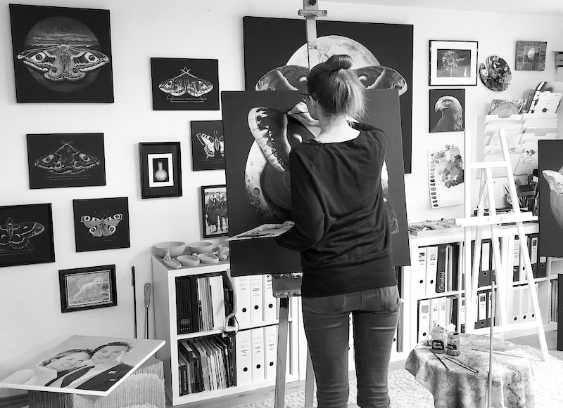 Doch schnell war mir beim Betrachten der Nachtschwärmer klar, dass ich diese in Farbe (Öl auf Leinwand) einfangen muss. Eine weitere Dimension kam durch die planetare Komposition zum Ausdruck. Dieses Aufeinandertreffen von scheinbar nicht korrelierenden Elementen liegt in meiner persönlichen Überzeugung begründet, dass sich alle Formen, Muster und Farben im Kleinen wie im Großen in der Natur widerspiegeln. Diese Muster- und Farbharmonien versuche ich in den Bildern einzufangen.