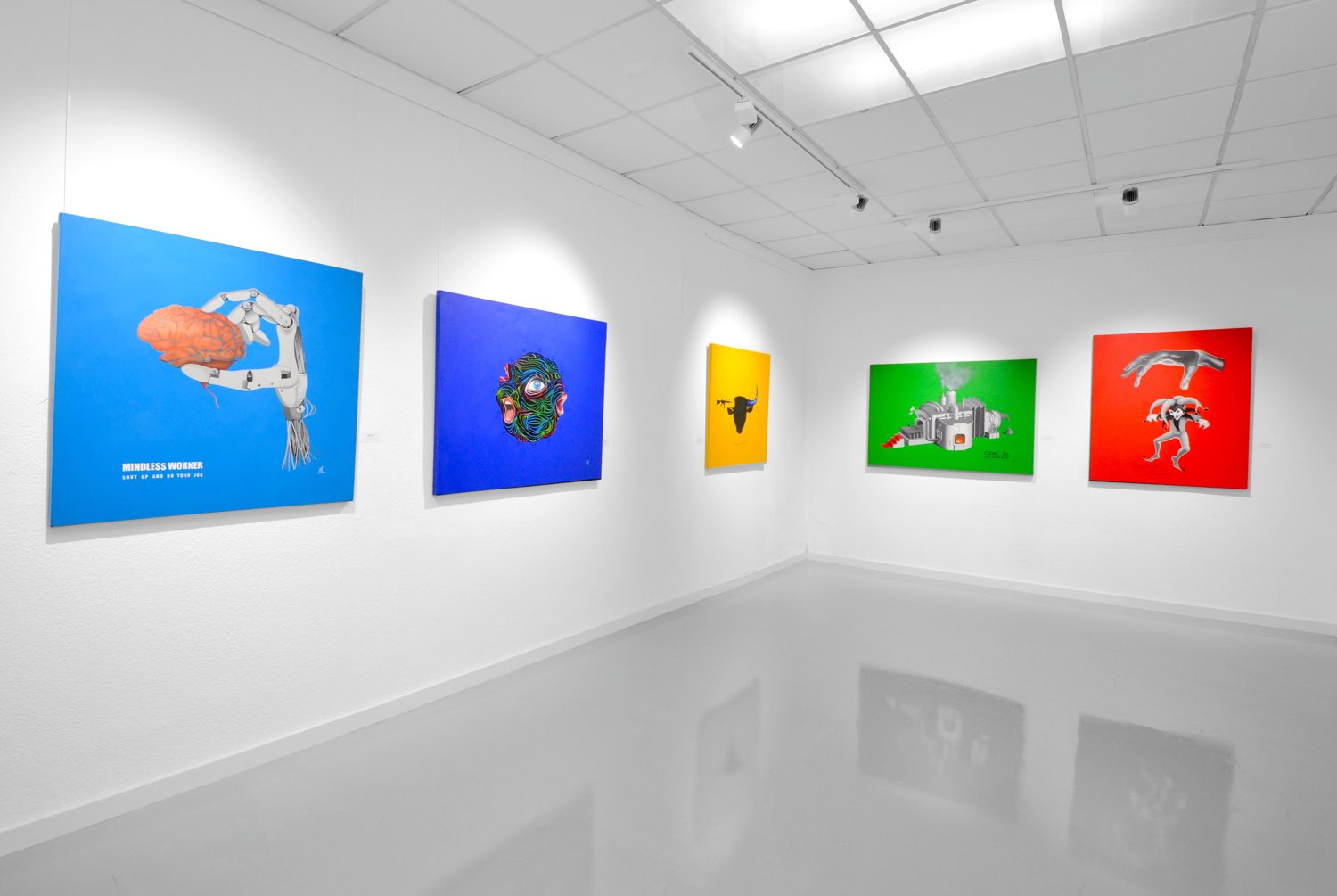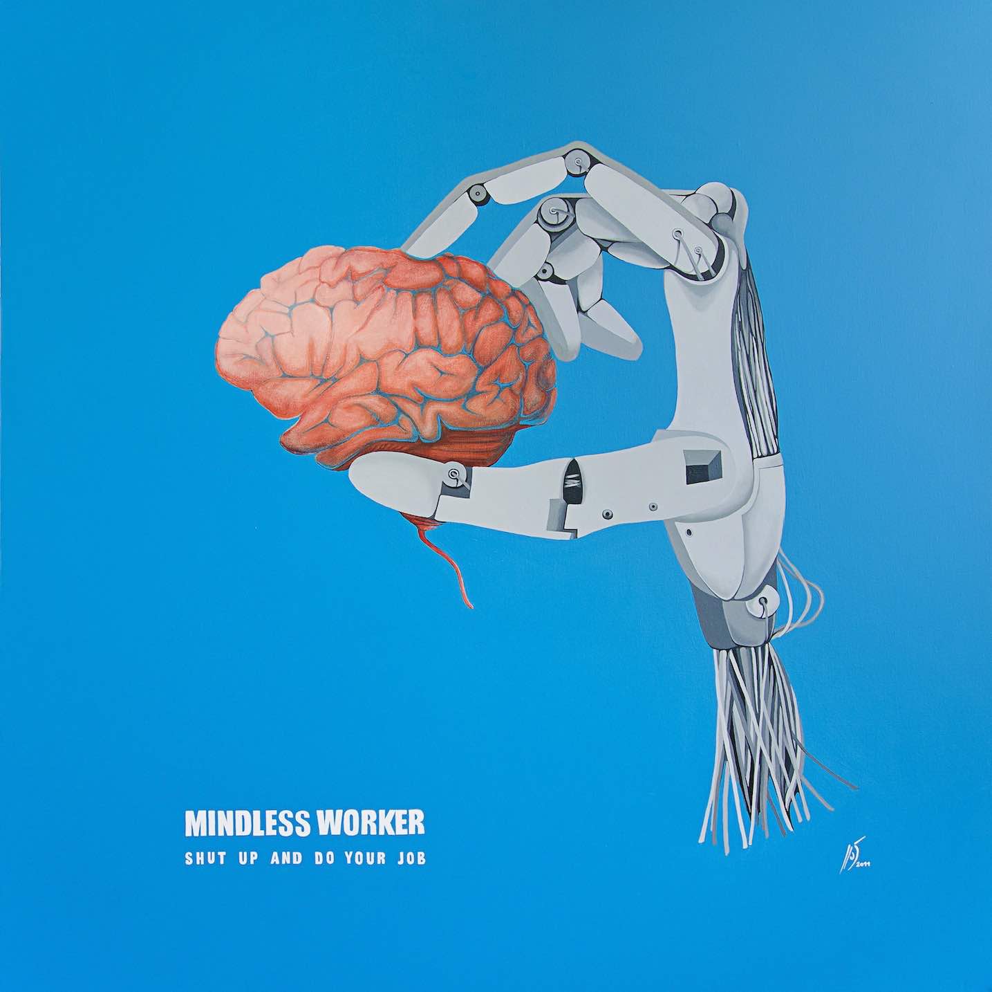 Die sechs großformatigen Werke „Mindless Worker“, „Quasselsynapse“, „Hommage á Heidi“, „Come in, and burn out“, „Pirouette der Marionette“ und „Leben auf großem Fuß“ der ersten Serie handeln vom Menschsein inmitten des heutigen wirtschaftlichen Umfelds.